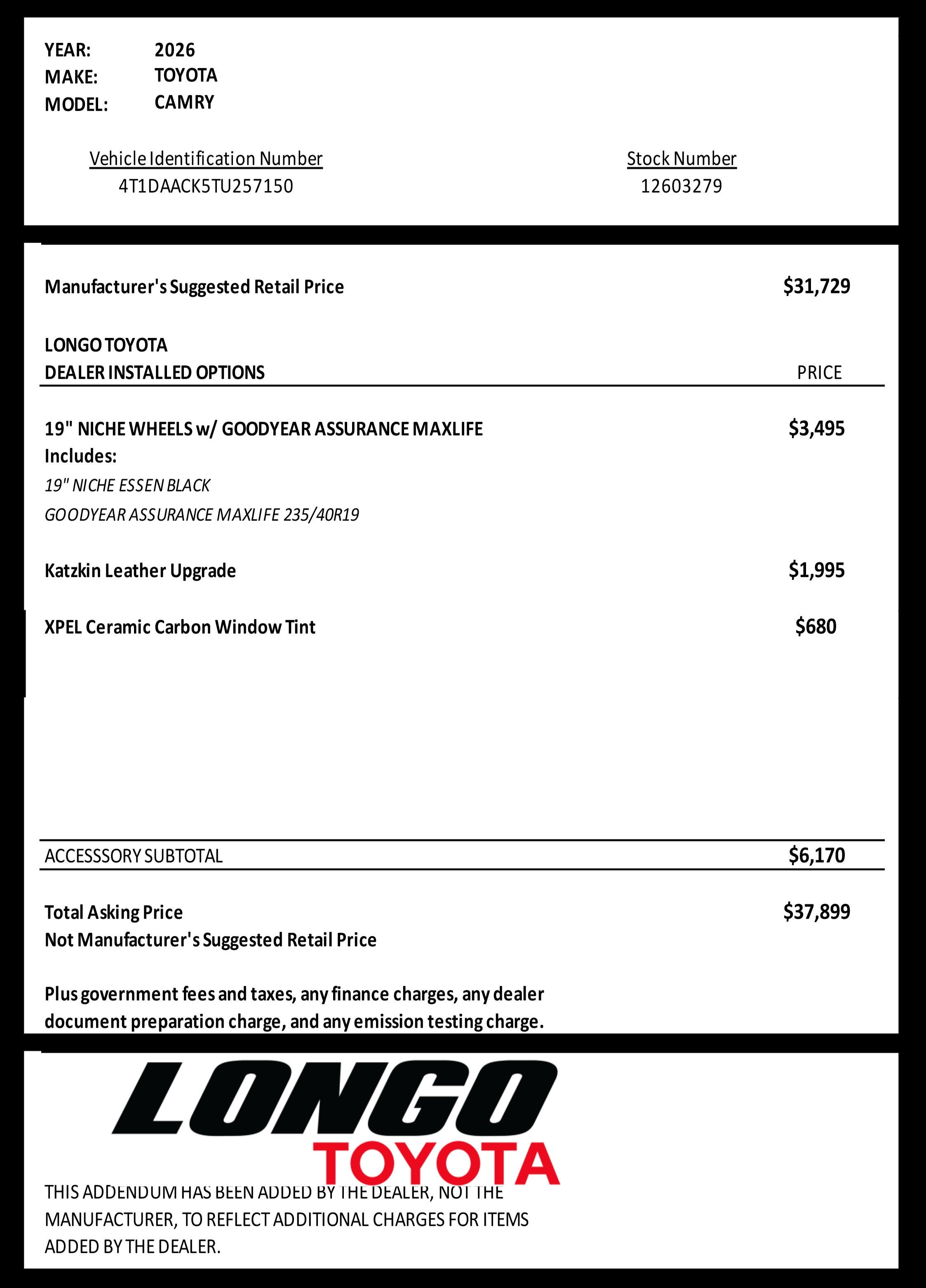 Dealer Installed Accessories do not include any additional optional accessories customer may choose to add to vehicle.
