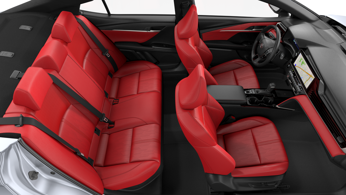 - Automatic High Beams (AHB) and auto on/off~Exterior@Racing-inspired gloss-black air curtains and color-keyed front side canards~Exterior@Color-keyed sport mesh front grille~Exterior@Premium LED combination taillights~Exterior@Color-keyed rear sport lower diffuser~Exterior@Sport side rocker panels~Exterior@Black rear spoiler~Exterior@Black window trim~Exterior@Color-keyed outside door handles with touch-sensor lock/unlock feature~Exterior@Acoustic noise-reducing front windshield~Exterior@Acoustic noise-reducing front side glass~Exterior@19-in. smoked gray and black-finished alloy wheels~Exterior@Washer-linked intermittent windshield wipers~Exterior@Black rear "CAMRY" lettering~Interior@White LED ambient interior lighting~Interior@Two front and two rear cup holders; two front door and two rear bottle holders~Interior@Covered center console