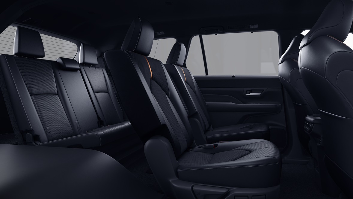 - 7-passenger seating with second-row fold-down captain's chairs and fold-down inboard armrests, adjustable headrests and two cup holders mounted on the floor; and 60/40 split, fold-down third-row seats with sliding headrests and recline function