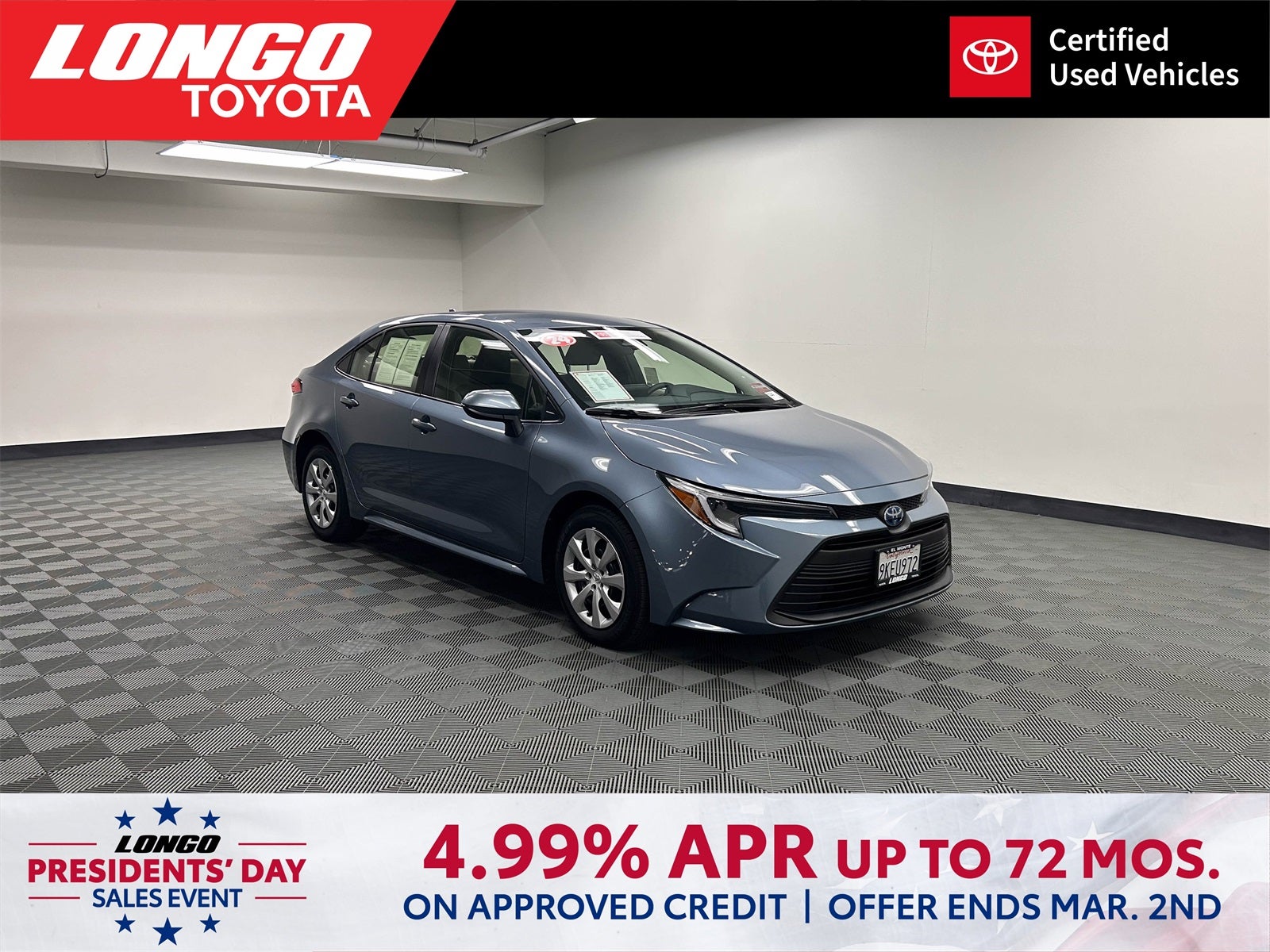 *4.99% APR for up to 72 months on all Toyota Certified Pre-Owned Camry, Corolla, RAV4, bz4X, bZ and Mirai. 72 monthly payments of $16.10 for every $1,000 financed. Plus government fees and taxes, any finance charges, a dealer document processing charge of $85, any electronic filing charge and any emission testing charge. All vehicles subject to prior sales. Terms available on approved credit for above average Tier 1 and Tier 1+ customers/lessees through participating Toyota dealers and Toyota Financial Services (TFS). No down payment required if qualify for advertised offer. If you do not qualify for the offer, the amount and percentage of any down payment may vary with your credit qualifications. Dealer participation may affect consumer cost. Individual dealer prices, other terms and offers may vary. Must take retail delivery from Longo Toyota's stock and terms subject to vehicle availability. See Longo Toyota for details. Offer expires on the date posted. Void where prohibited. Expires 03/02/2026